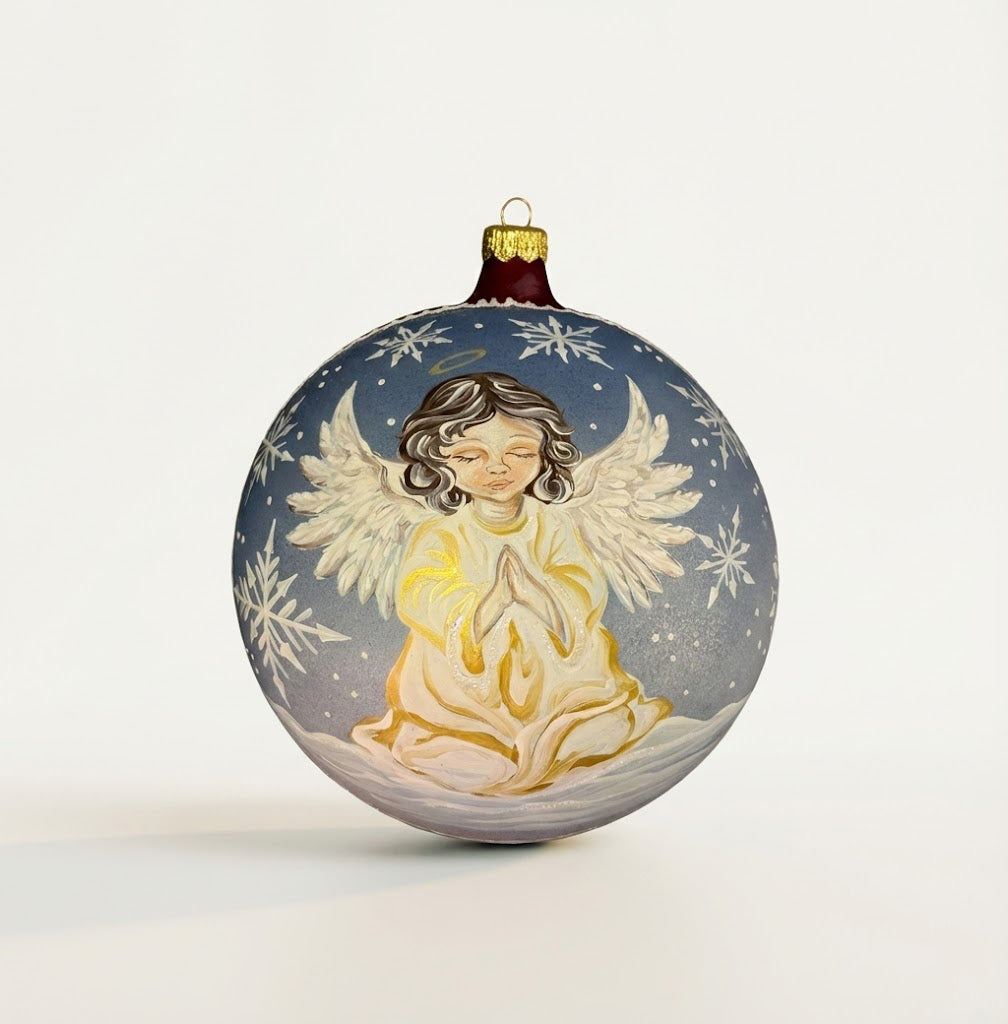 Al centro della scena, un angelo in preghiera: il volto delicato, le ali dipinte con toni di bianco avorio e ombre grigio chiaro, le vesti nelle sfumature del giallo tenue con accenti dorati. Ogni dettaglio è applicato a mano, senza stampi o riproduzioni in serie, rendendo ogni sfera diversa da tutte le altre.