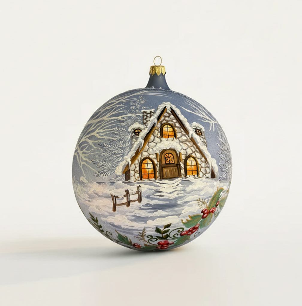 Sfera in vetro soffiato Ø 150 mm dipinta a mano con casetta innevata