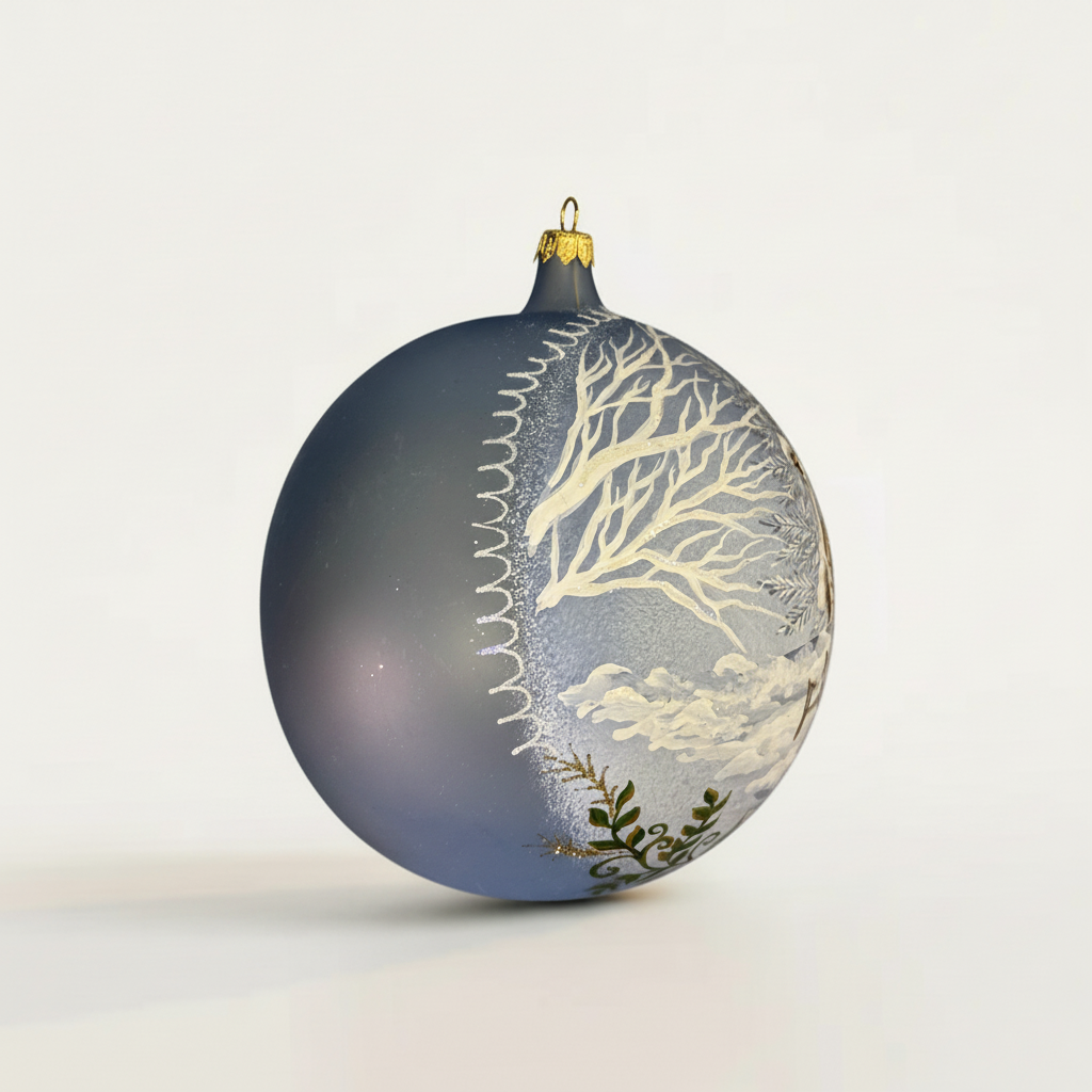 Questa sfera da Ø 150 mm è realizzata in vetro borosilicato soffiato a bocca e decorata interamente a mano nel nostro laboratorio di Bellagio. La superficie opaca sfuma dal grigio-blu al perla, creando un fondo morbido che accoglie una scena invernale luminosa e dettagliata.