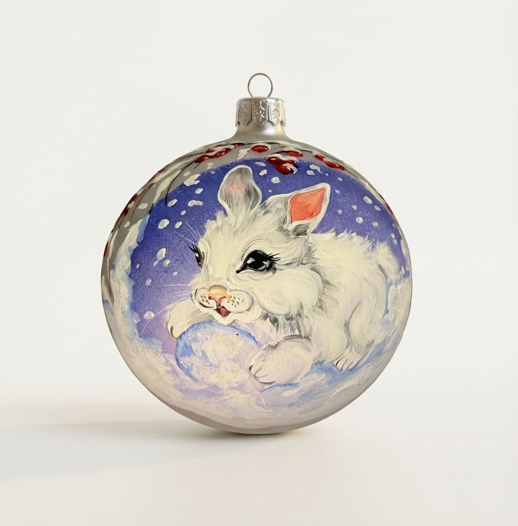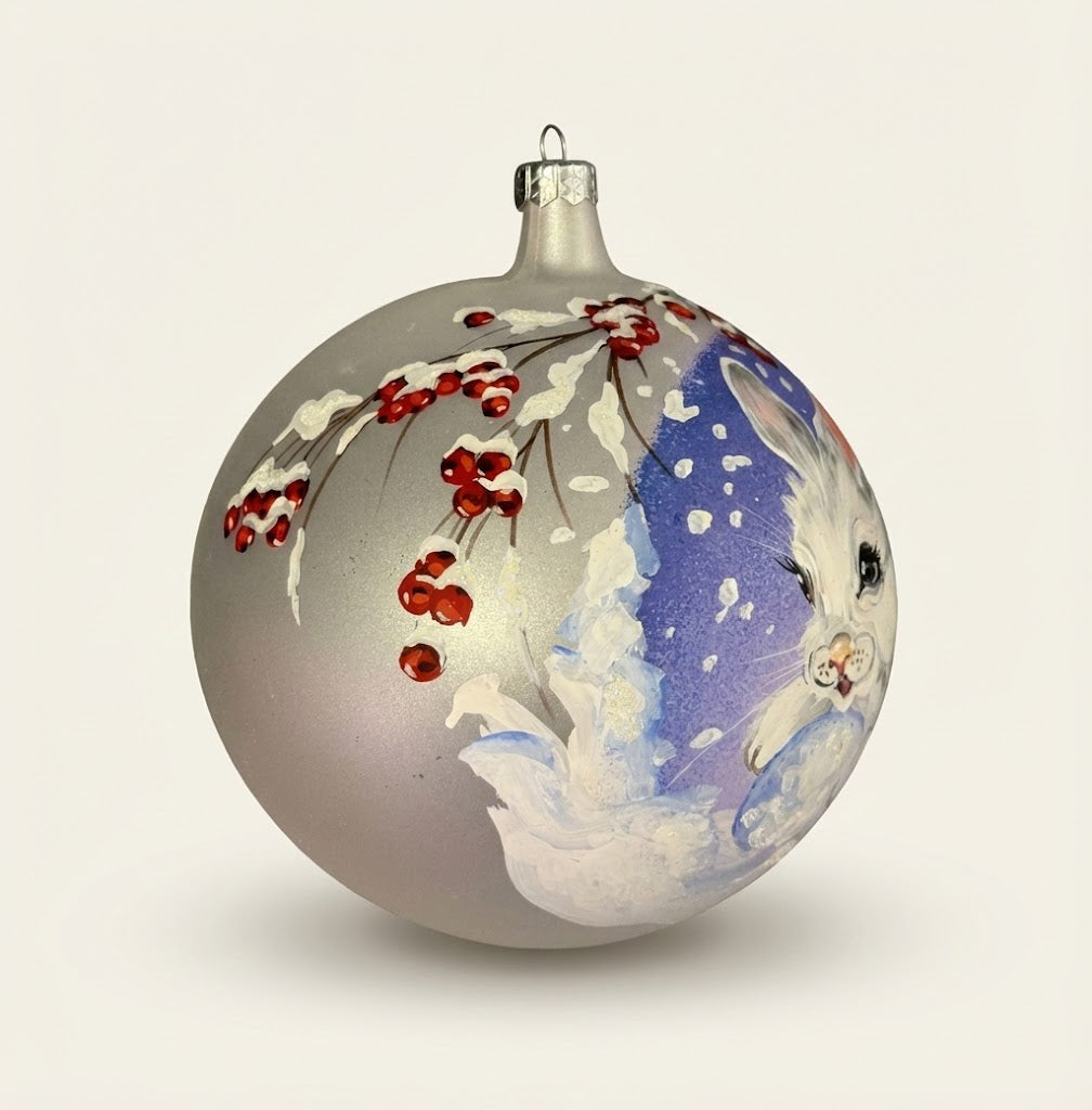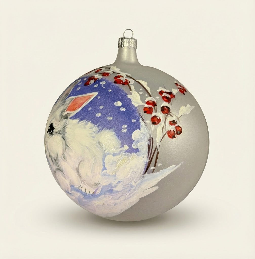 Questa sfera da Ø 150 mm è realizzata in vetro borosilicato soffiato a bocca e decorata interamente a mano nel nostro laboratorio di Bellagio. La base opaca color argento crea un contrasto elegante con la scena principale: un coniglietto bianco immerso nella neve, dipinto con toni morbidi di bianco latte, grigio perla e sfumature rosate sulle orecchie.
