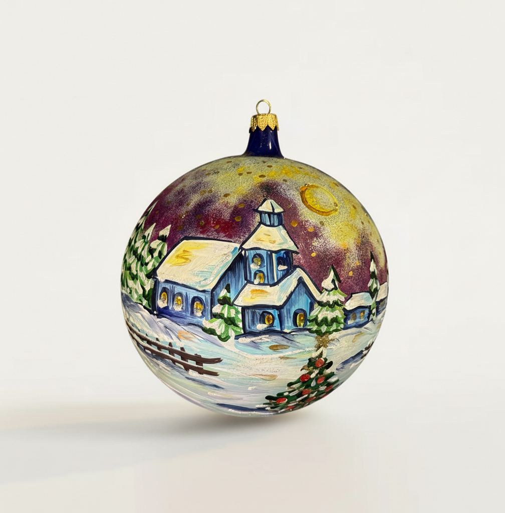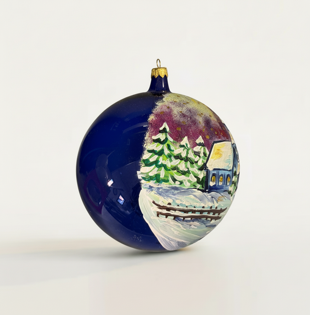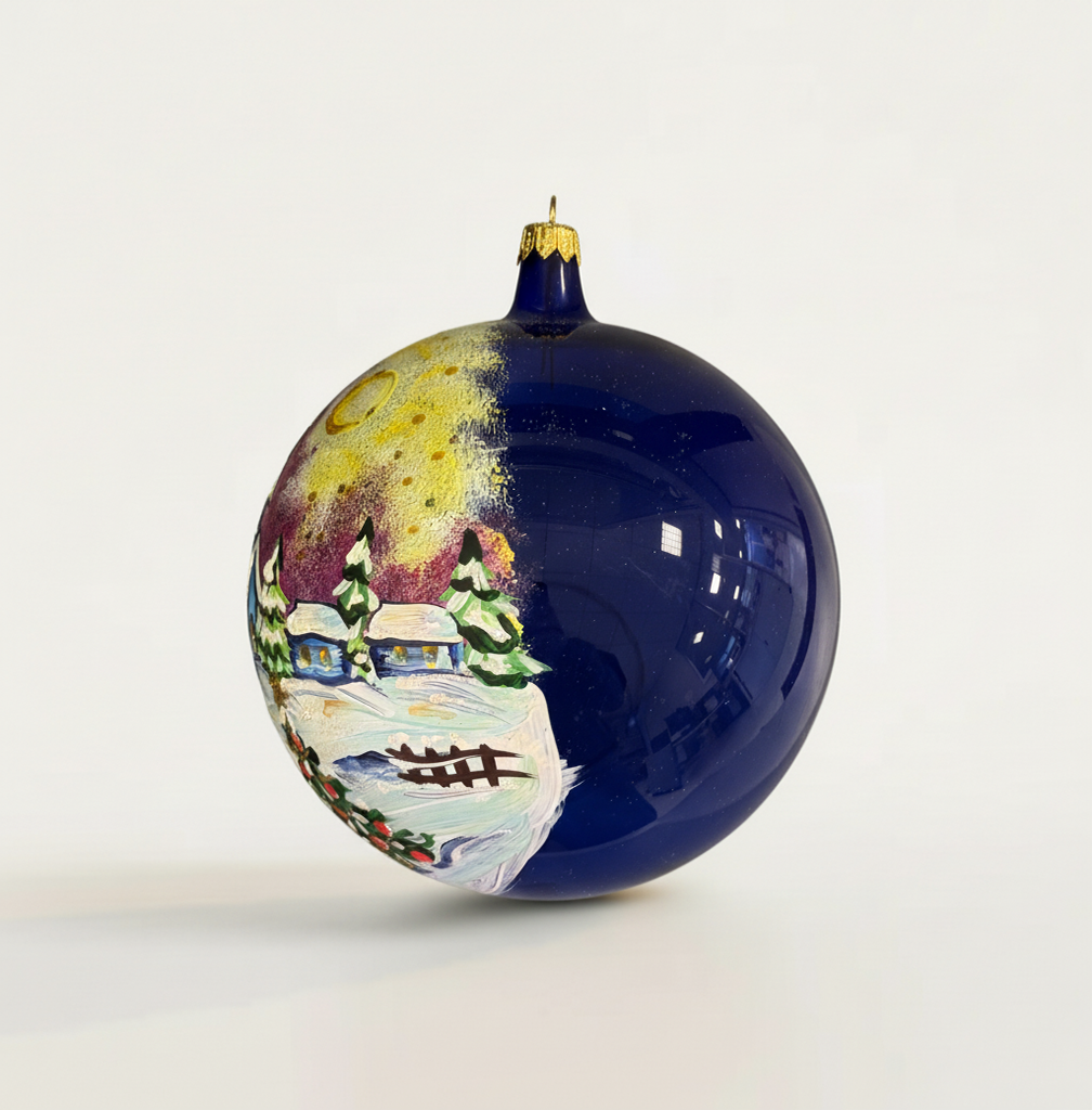 Questa sfera da Ø 150 mm, realizzata in vetro borosilicato soffiato a bocca e decorata interamente a mano nel nostro laboratorio di Bellagio, rappresenta un paesaggio invernale immerso in una notte luminosa e profonda.