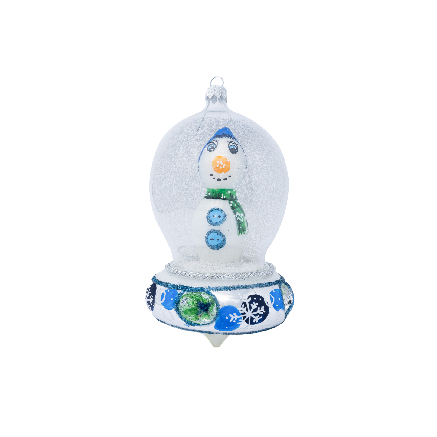 Ufo in vetro soffiato argentato, decoro pupazzo di neve , con cupola, da appendere, H. 20cm.